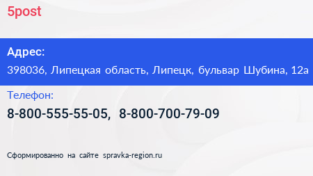 5post по адресу 398036, Липецкая область, Липецк, бульвар Шубина, 12а в дальнейшем Организация, размещена в следующих категориях: