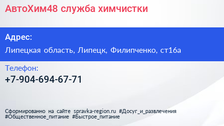 АвтоХим48, служба химчистки по адресу Липецкая область, Липецк, Филипченко, ст16а в дальнейшем Организация, размещена в следующих категориях:
