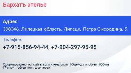 Бархатъ, ателье по адресу 398046, Липецкая область, Липецк, Петра Смородина, 5 в дальнейшем Организация, размещена в следующих категориях: