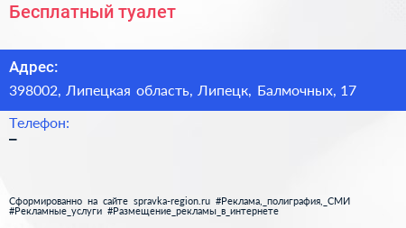 Бесплатный туалет по адресу 398002, Липецкая область, Липецк, Балмочных, 17 в дальнейшем Организация, размещена в следующих категориях: