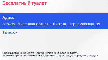 Бесплатный туалет по адресу 398059, Липецкая область, Липецк, Первомайская, 35 в дальнейшем Организация, размещена в следующих категориях: