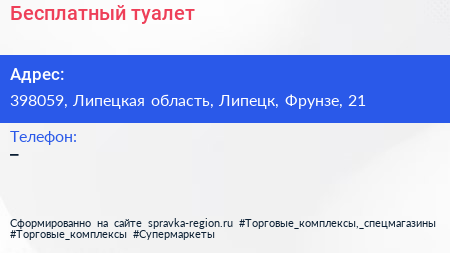 Бесплатный туалет по адресу 398059, Липецкая область, Липецк, Фрунзе, 21 в дальнейшем Организация, размещена в следующих категориях: