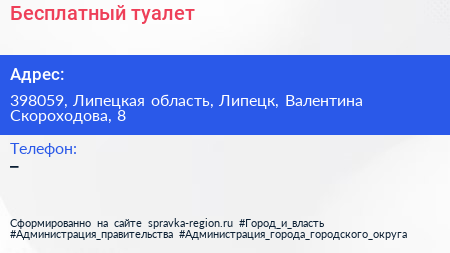 Бесплатный туалет по адресу 398059, Липецкая область, Липецк, Валентина Скороходова, 8 в дальнейшем Организация, размещена в следующих категориях:
