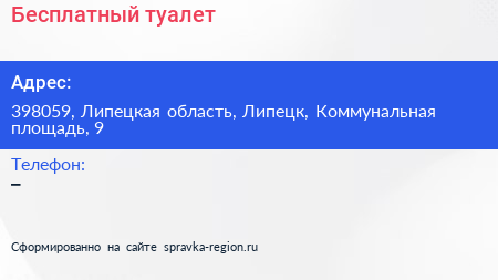 Бесплатный туалет по адресу 398059, Липецкая область, Липецк, Коммунальная площадь, 9 в дальнейшем Организация, размещена в следующих категориях:
