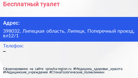 Бесплатный туалет по адресу 398032, Липецкая область, Липецк, Поперечный проезд, вл12/1 в дальнейшем Организация, размещена в следующих категориях: