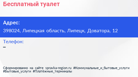 Бесплатный туалет по адресу 398024, Липецкая область, Липецк, Доватора, 12 в дальнейшем Организация, размещена в следующих категориях: