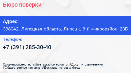 Бюро поверки по адресу 398042, Липецкая область, Липецк, 9-й микрорайон, 23Б в дальнейшем Организация, размещена в следующих категориях: