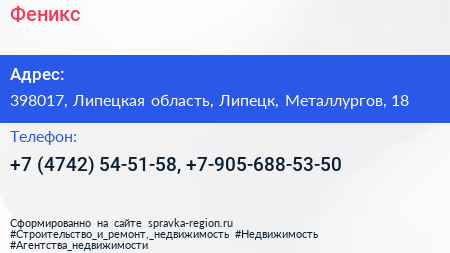 Феникс по адресу 398017, Липецкая область, Липецк, Металлургов, 18 в дальнейшем Организация, размещена в следующих категориях:
