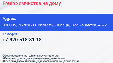 Fresh, химчистка на дому по адресу 398035, Липецкая область, Липецк, Космонавтов, 45/2 в дальнейшем Организация, размещена в следующих категориях: