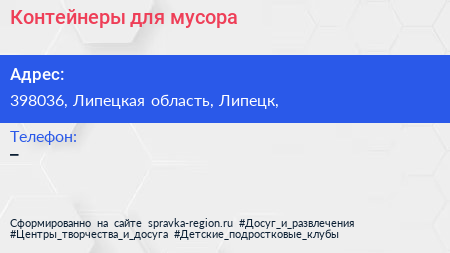 Контейнеры для мусора по адресу 398036, Липецкая область, Липецк, в дальнейшем Организация, размещена в следующих категориях: