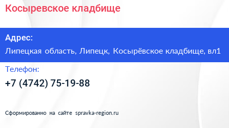 Косыревское кладбище по адресу Липецкая область, Липецк, Косырёвское кладбище, вл1 в дальнейшем Организация, размещена в следующих категориях: