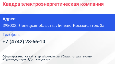 Квадра, электроэнергетическая компания по адресу 398002, Липецкая область, Липецк, Космонавтов, 3а в дальнейшем Организация, размещена в следующих категориях: