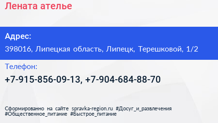 Лената, ателье по адресу 398016, Липецкая область, Липецк, Терешковой, 1/2 в дальнейшем Организация, размещена в следующих категориях: