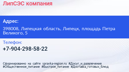 ЛипСЭС, компания по адресу 398008, Липецкая область, Липецк, площадь Петра Великого, 5 в дальнейшем Организация, размещена в следующих категориях: