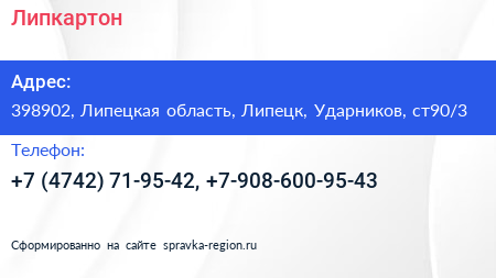 Липкартон по адресу 398902, Липецкая область, Липецк, Ударников, ст90/3 в дальнейшем Организация, размещена в следующих категориях: