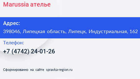 Marussia, ателье по адресу 398046, Липецкая область, Липецк, Индустриальная, 162 в дальнейшем Организация, размещена в следующих категориях: