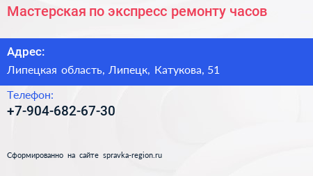 Мастерская по экспресс-ремонту часов по адресу Липецкая область, Липецк, Катукова, 51 в дальнейшем Организация, размещена в следующих категориях: