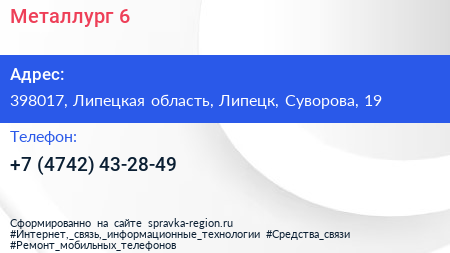 Металлург-6 по адресу 398017, Липецкая область, Липецк, Суворова, 19 в дальнейшем Организация, размещена в следующих категориях: