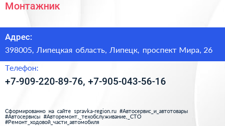 Монтажник по адресу 398005, Липецкая область, Липецк, проспект Мира, 26 в дальнейшем Организация, размещена в следующих категориях: