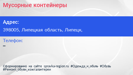 Мусорные контейнеры по адресу 398005, Липецкая область, Липецк, в дальнейшем Организация, размещена в следующих категориях: