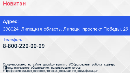 Новитэн по адресу 398024, Липецкая область, Липецк, проспект Победы, 29 в дальнейшем Организация, размещена в следующих категориях: