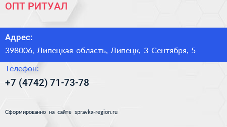 ОПТ-РИТУАЛ по адресу 398006, Липецкая область, Липецк, 3 Сентября, 5 в дальнейшем Организация, размещена в следующих категориях: