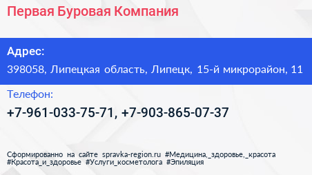 Первая Буровая Компания по адресу 398058, Липецкая область, Липецк, 15-й микрорайон, 11 в дальнейшем Организация, размещена в следующих категориях: