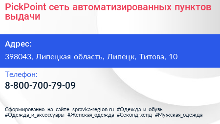 PickPoint, сеть автоматизированных пунктов выдачи по адресу 398043, Липецкая область, Липецк, Титова, 10 в дальнейшем Организация, размещена в следующих категориях: