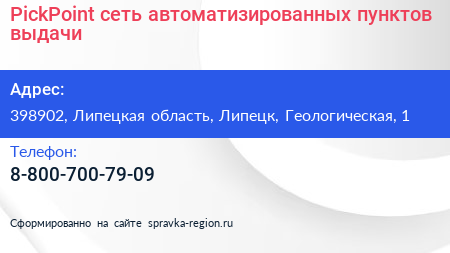 PickPoint, сеть автоматизированных пунктов выдачи по адресу 398902, Липецкая область, Липецк, Геологическая, 1 в дальнейшем Организация, размещена в следующих категориях: