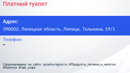Платный туалет по адресу 398002, Липецкая область, Липецк, Тельмана, 19/1 в дальнейшем Организация, размещена в следующих категориях: