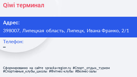 Qiwi, терминал по адресу 398007, Липецкая область, Липецк, Ивана Франко, 2/1 в дальнейшем Организация, размещена в следующих категориях: