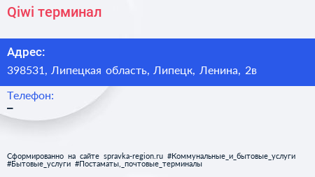 Qiwi, терминал по адресу 398531, Липецкая область, Липецк, Ленина, 2в в дальнейшем Организация, размещена в следующих категориях: