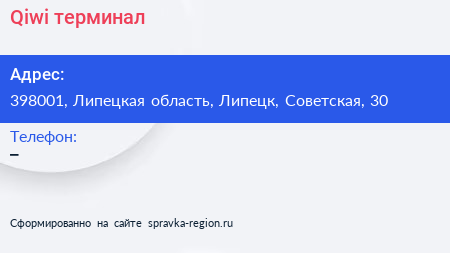 Qiwi, терминал по адресу 398001, Липецкая область, Липецк, Советская, 30 в дальнейшем Организация, размещена в следующих категориях: