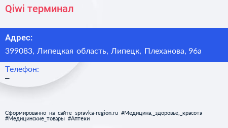 Qiwi, терминал по адресу 399083, Липецкая область, Липецк, Плеханова, 96а в дальнейшем Организация, размещена в следующих категориях: