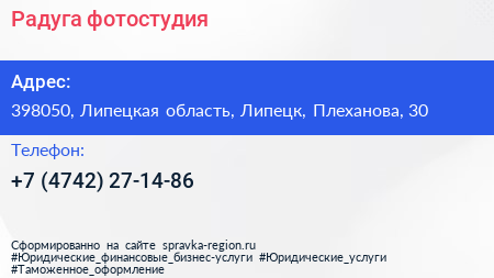 Радуга, фотостудия по адресу 398050, Липецкая область, Липецк, Плеханова, 30 в дальнейшем Организация, размещена в следующих категориях: