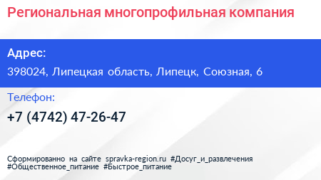 Региональная многопрофильная компания по адресу 398024, Липецкая область, Липецк, Союзная, 6 в дальнейшем Организация, размещена в следующих категориях: