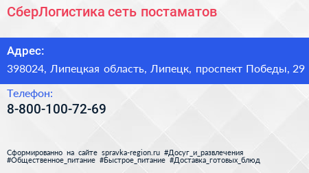 СберЛогистика, сеть постаматов по адресу 398024, Липецкая область, Липецк, проспект Победы, 29 в дальнейшем Организация, размещена в следующих категориях: