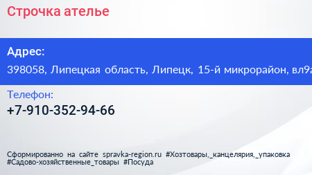 Строчка, ателье по адресу 398058, Липецкая область, Липецк, 15-й микрорайон, вл9а в дальнейшем Организация, размещена в следующих категориях:
