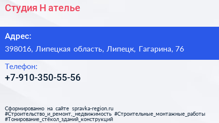 Студия Н, ателье по адресу 398016, Липецкая область, Липецк, Гагарина, 76 в дальнейшем Организация, размещена в следующих категориях: