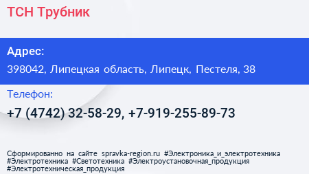 ТСН Трубник по адресу 398042, Липецкая область, Липецк, Пестеля, 38 в дальнейшем Организация, размещена в следующих категориях: