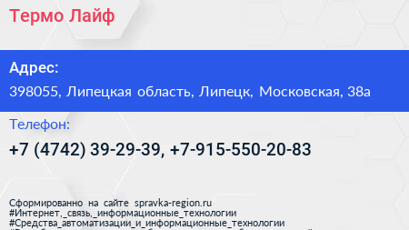 Термо Лайф по адресу 398055, Липецкая область, Липецк, Московская, 38а в дальнейшем Организация, размещена в следующих категориях: