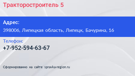 Тракторостроитель-5 по адресу 398006, Липецкая область, Липецк, Бачурина, 16 в дальнейшем Организация, размещена в следующих категориях: