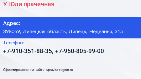 У Юли, прачечная по адресу 398059, Липецкая область, Липецк, Неделина, 31а в дальнейшем Организация, размещена в следующих категориях: