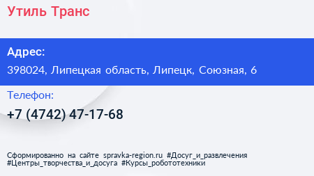 Утиль Транс по адресу 398024, Липецкая область, Липецк, Союзная, 6 в дальнейшем Организация, размещена в следующих категориях: