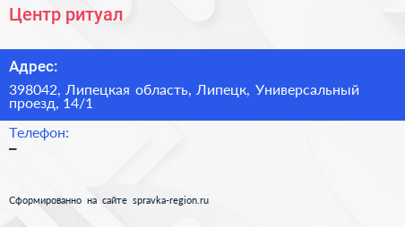Центр-ритуал по адресу 398042, Липецкая область, Липецк, Универсальный проезд, 14/1 в дальнейшем Организация, размещена в следующих категориях: