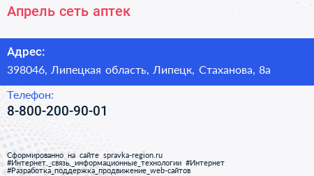 Апрель, сеть аптек по адресу 398046, Липецкая область, Липецк, Стаханова, 8а в дальнейшем Организация, размещена в следующих категориях:
