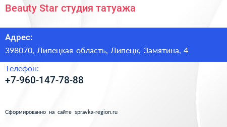 Beauty Star, студия татуажа по адресу 398070, Липецкая область, Липецк, Замятина, 4 в дальнейшем Организация, размещена в следующих категориях: