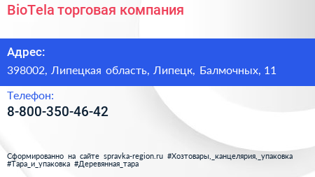 BioTela, торговая компания по адресу 398002, Липецкая область, Липецк, Балмочных, 11 в дальнейшем Организация, размещена в следующих категориях: