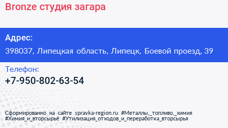 Bronze, студия загара по адресу 398037, Липецкая область, Липецк, Боевой проезд, 39 в дальнейшем Организация, размещена в следующих категориях: