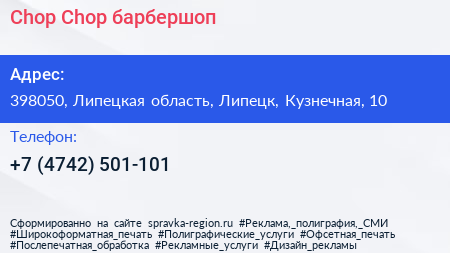 Chop-Chop, барбершоп по адресу 398050, Липецкая область, Липецк, Кузнечная, 10 в дальнейшем Организация, размещена в следующих категориях: